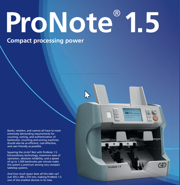 ProNote® 1.5 and ProNote® 1.5F can be configured to process up to 40 different currencies. With easy and rapid update options via an SD slot or USB port, both systems are well prepared to meet future requirements. Additionally, businesses with specific requirements can take advantage of a team of experts, who can demonstrate how ProNote1.5 and ProNote® 1.5F can be adapted to meet individual needs.